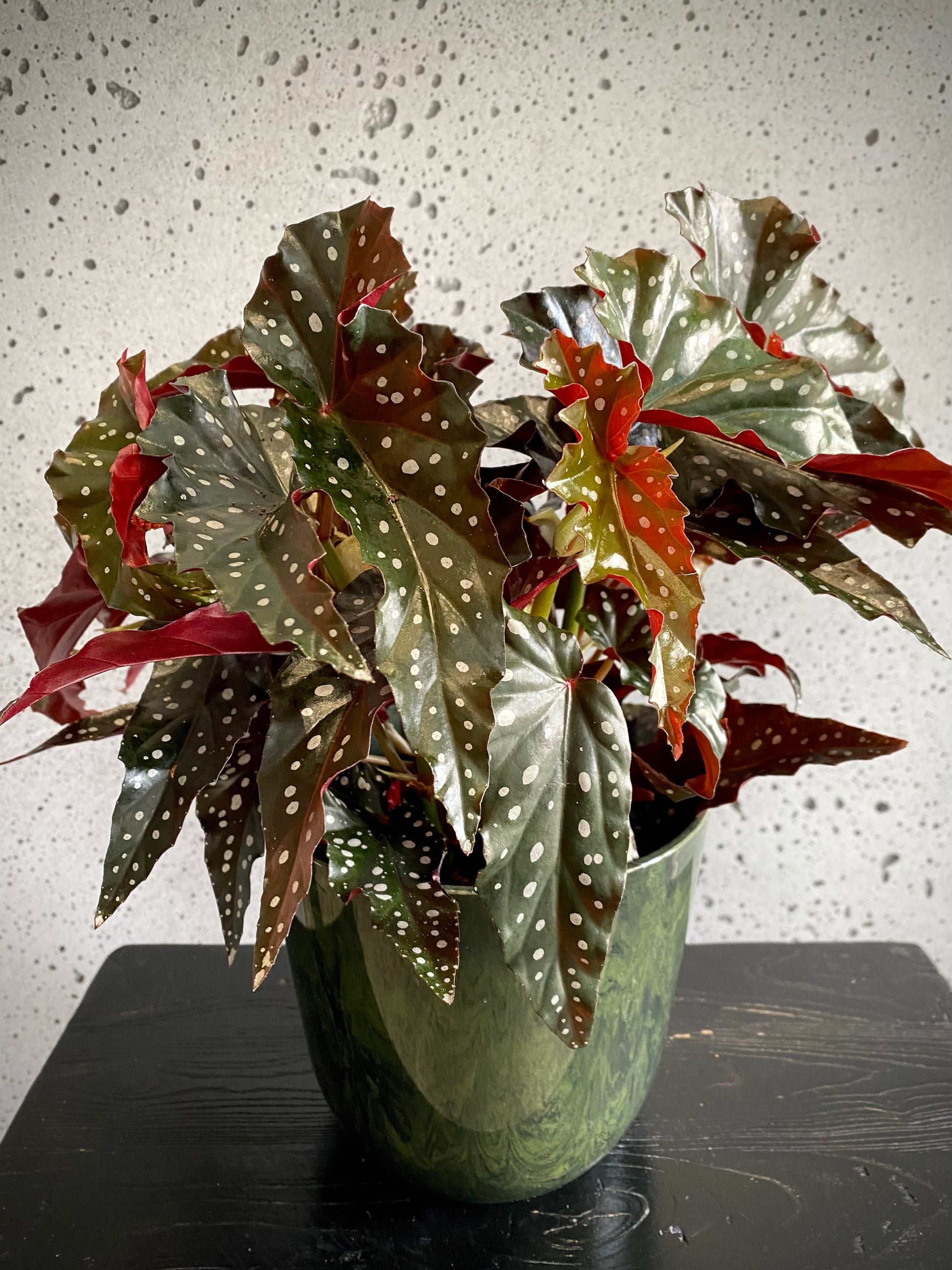 The Begonia 'Black Forest' is renowned for its dark, velvety leaves with striking patterns of silver and deep green.