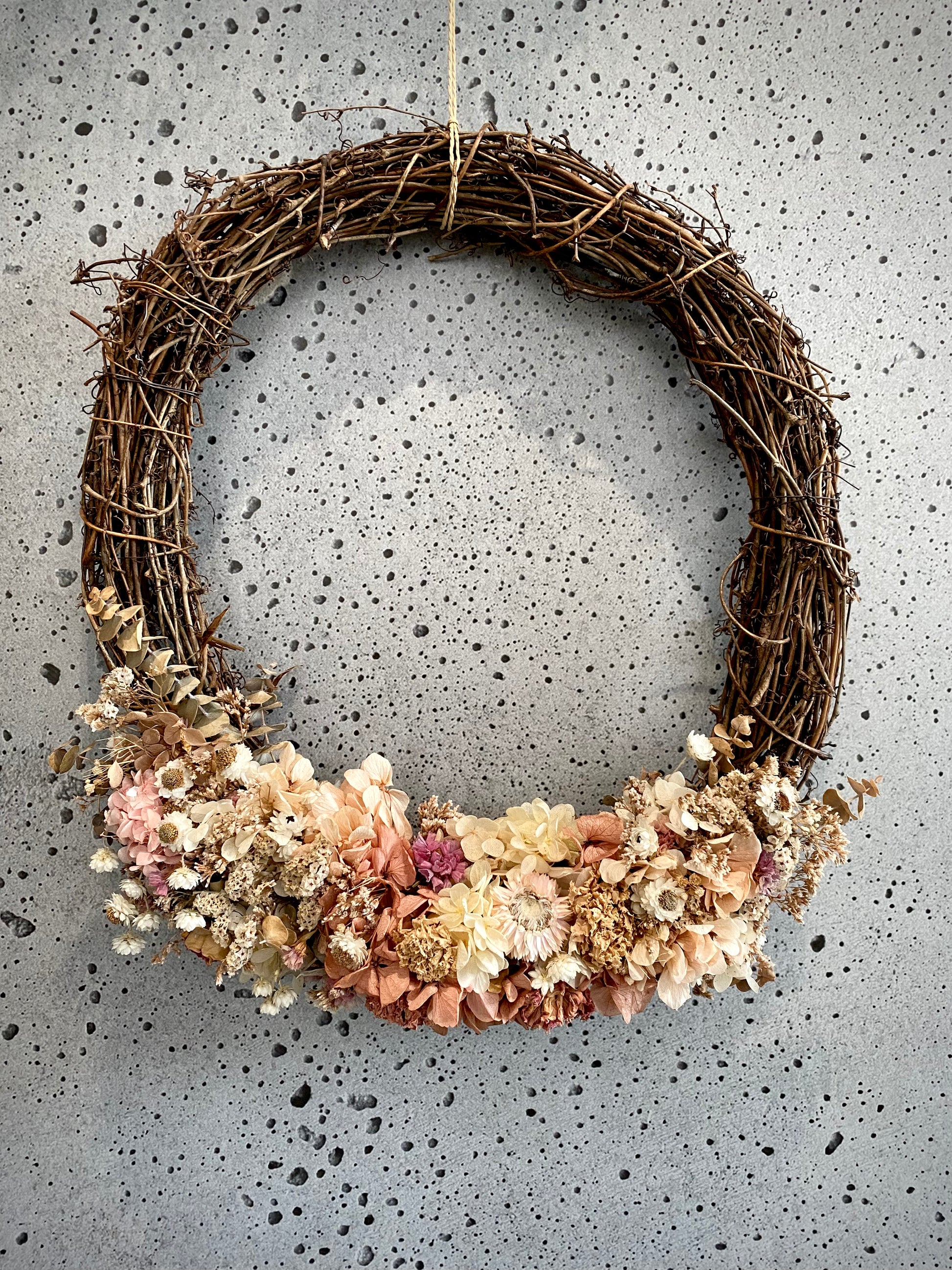 Hand-crafted with premium dried florals and set on a 40 cm twig base, this wreath brings texture, elegance, and an understated statement to any wall or door. Light, airy, and beautifully made.
