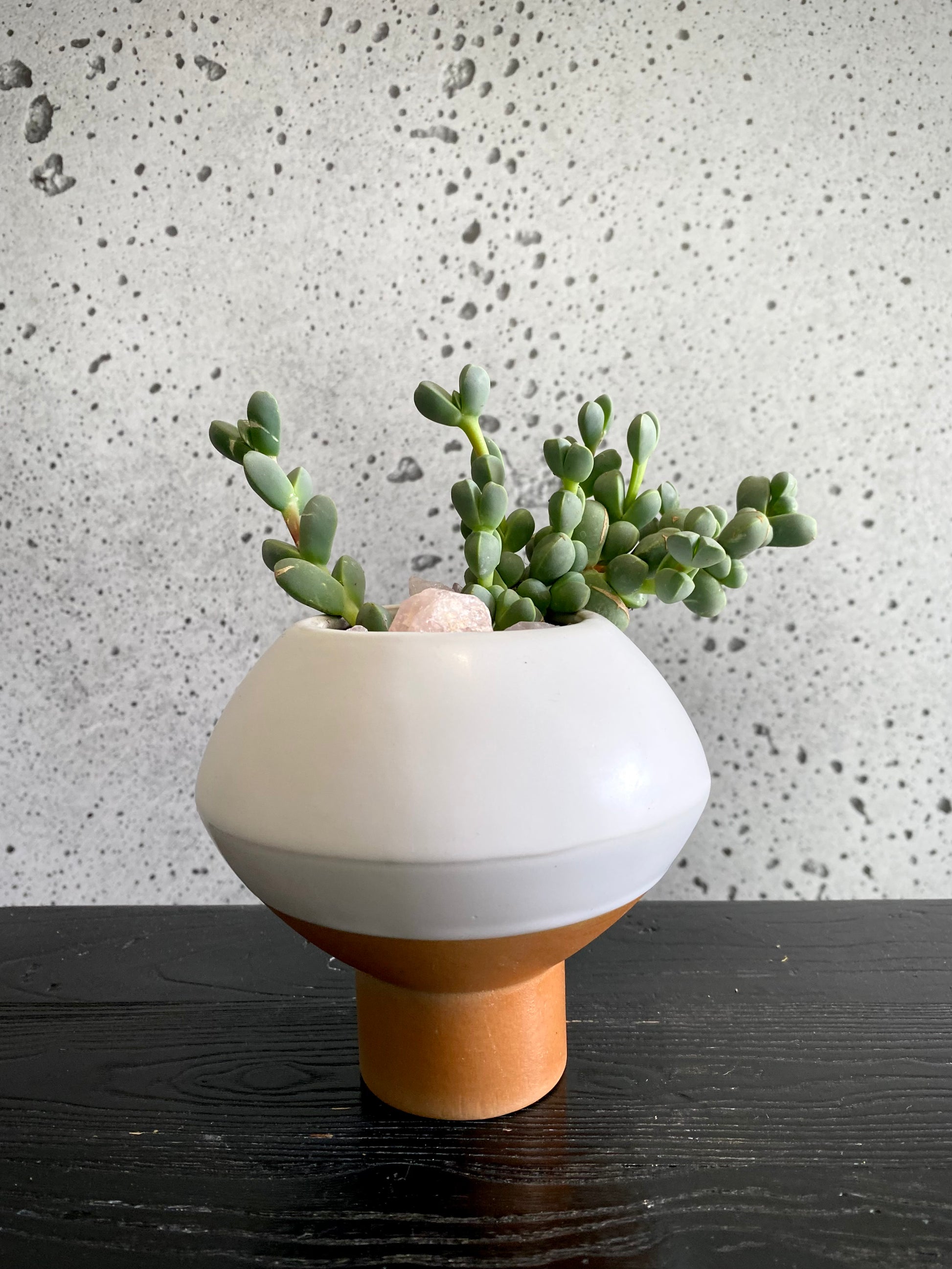 Succulent in our Japanese Hagi mini vase surrounded by rose quartz.
