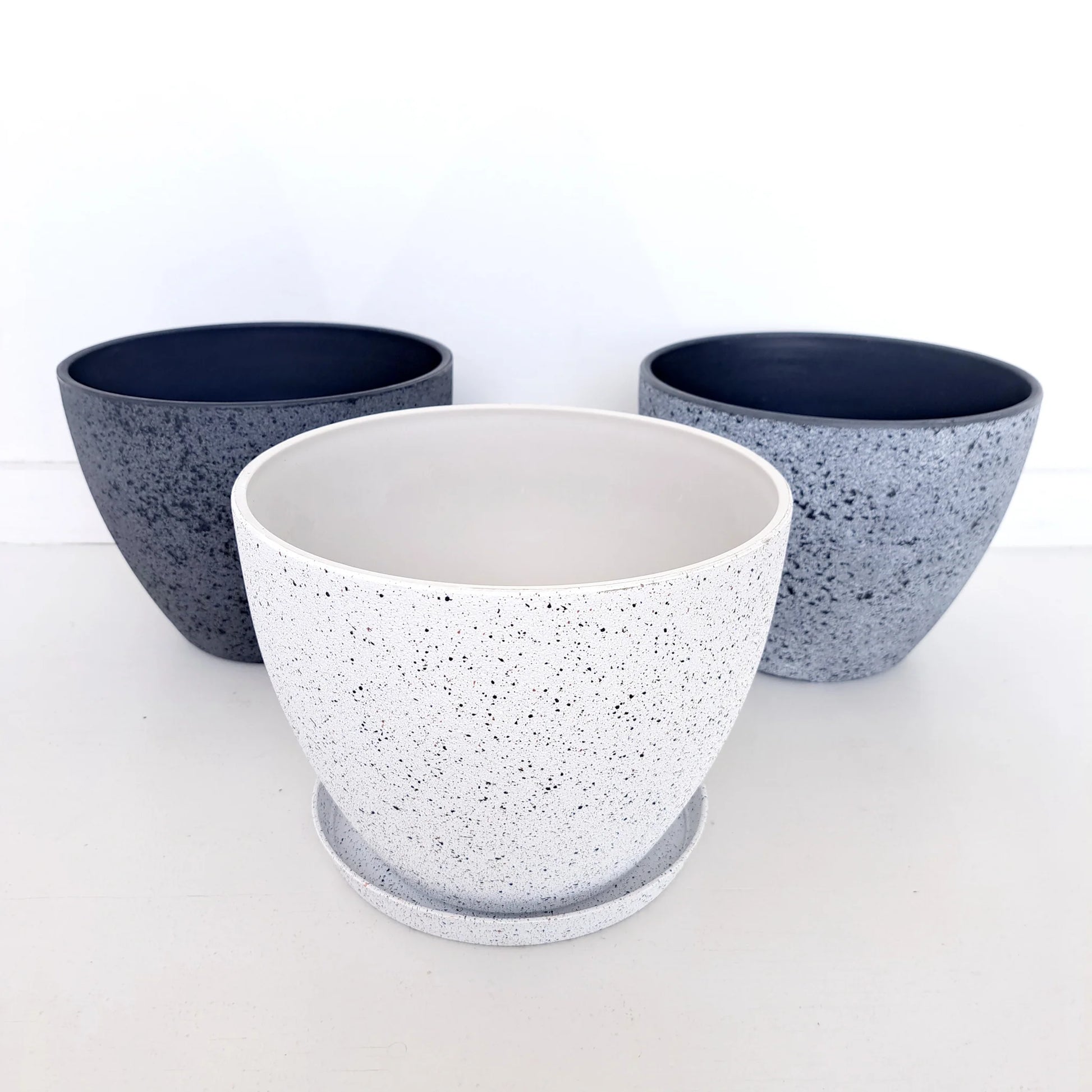Our Nova pots, made with Artstone and looking like concrete, are made from 50% natural stone and 50% recycled plastic, making them strong but lightweight for easy moving.